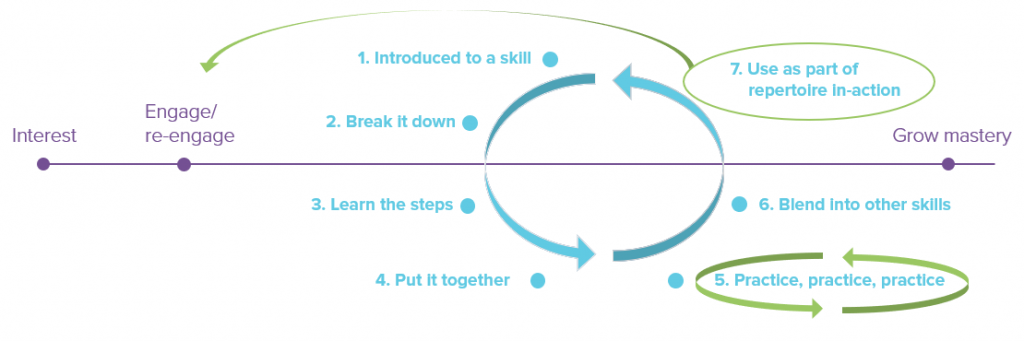 Another key difference is step 7: use the concept as part of the repertoire in-action. It’s essentially real-world application. We’ve all heard this a lot from kids: “why do I have to learn X; I’m never going to use it.” When kids do see value, it motivates and re-engages them in the learning process and the process can become a “virtuous cycle.”