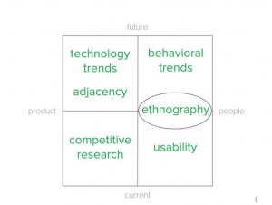 Here’s a way to look at ethnographic research. User research can be focused on a gradient from products to people and on a gradient of current or future needs and challenges. Usability testing, for example, focuses on people doing things with a current product and competitive research focuses on current product capabilities compared to each other.